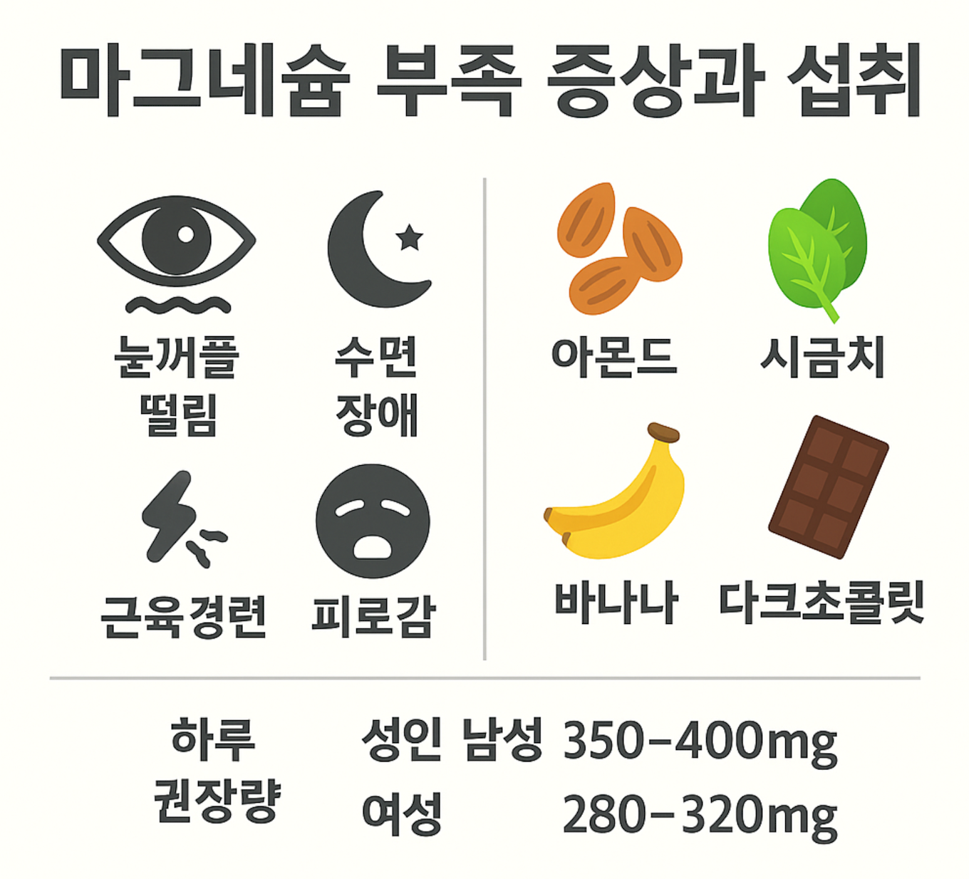 하지만 현대인의 식단과 생활 습관에서는 부족해지기 쉬우며, 피곤함, 경련, 불면, 집중력 저하 같은 증상으로 이어질 수 있습니다.